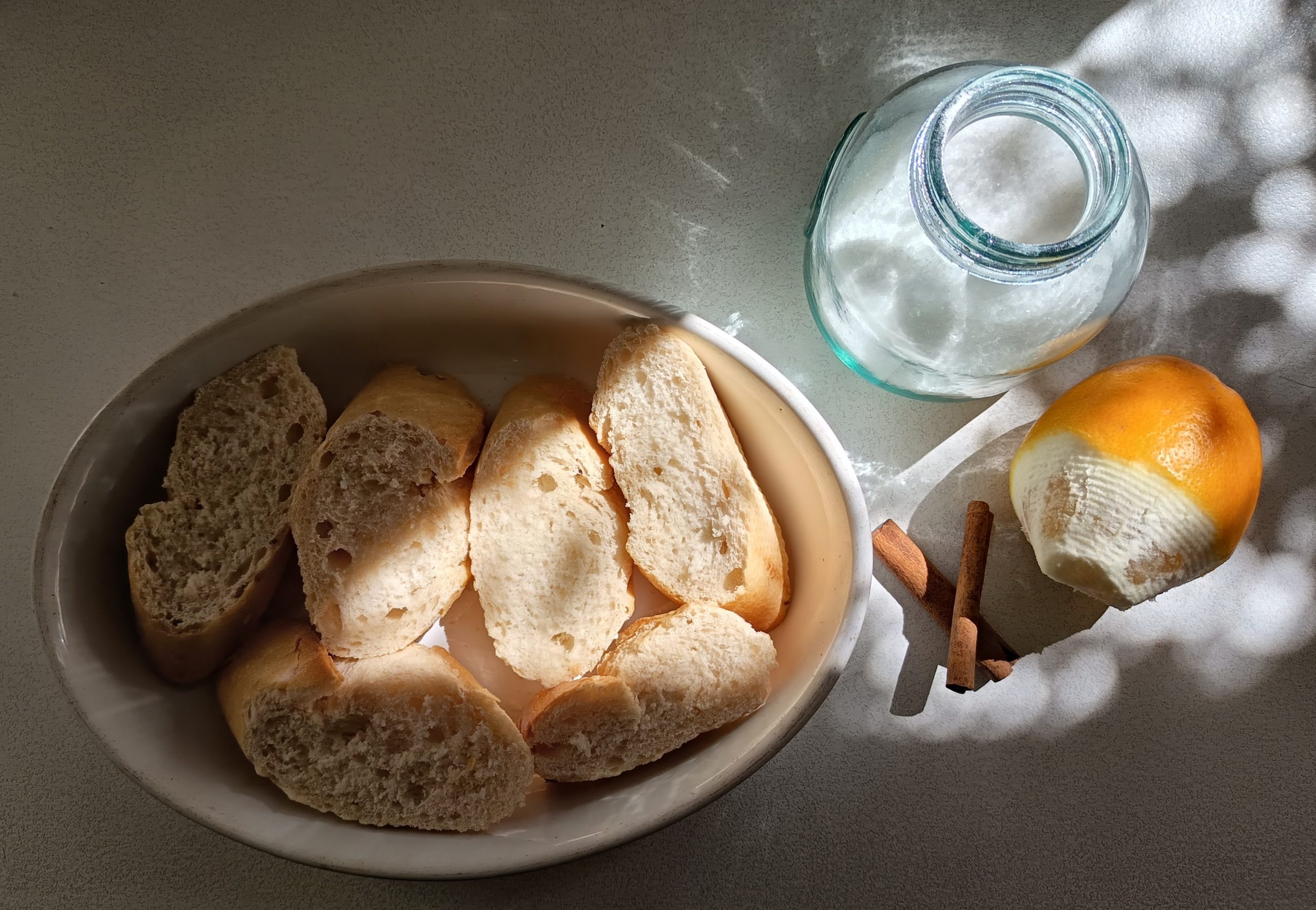 • Cortar el pan duro (de un par de días) en rodajas de al menos 1,5 o 2 cm de grosor y ponerlas en una fuente