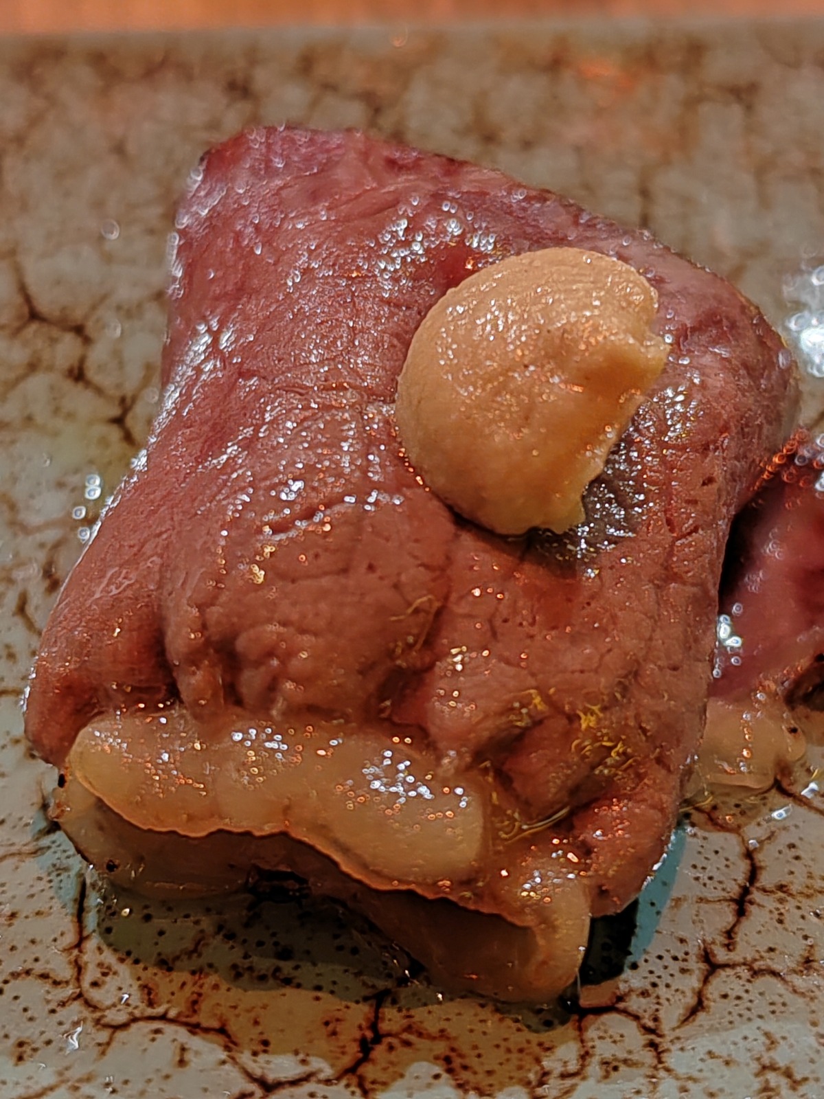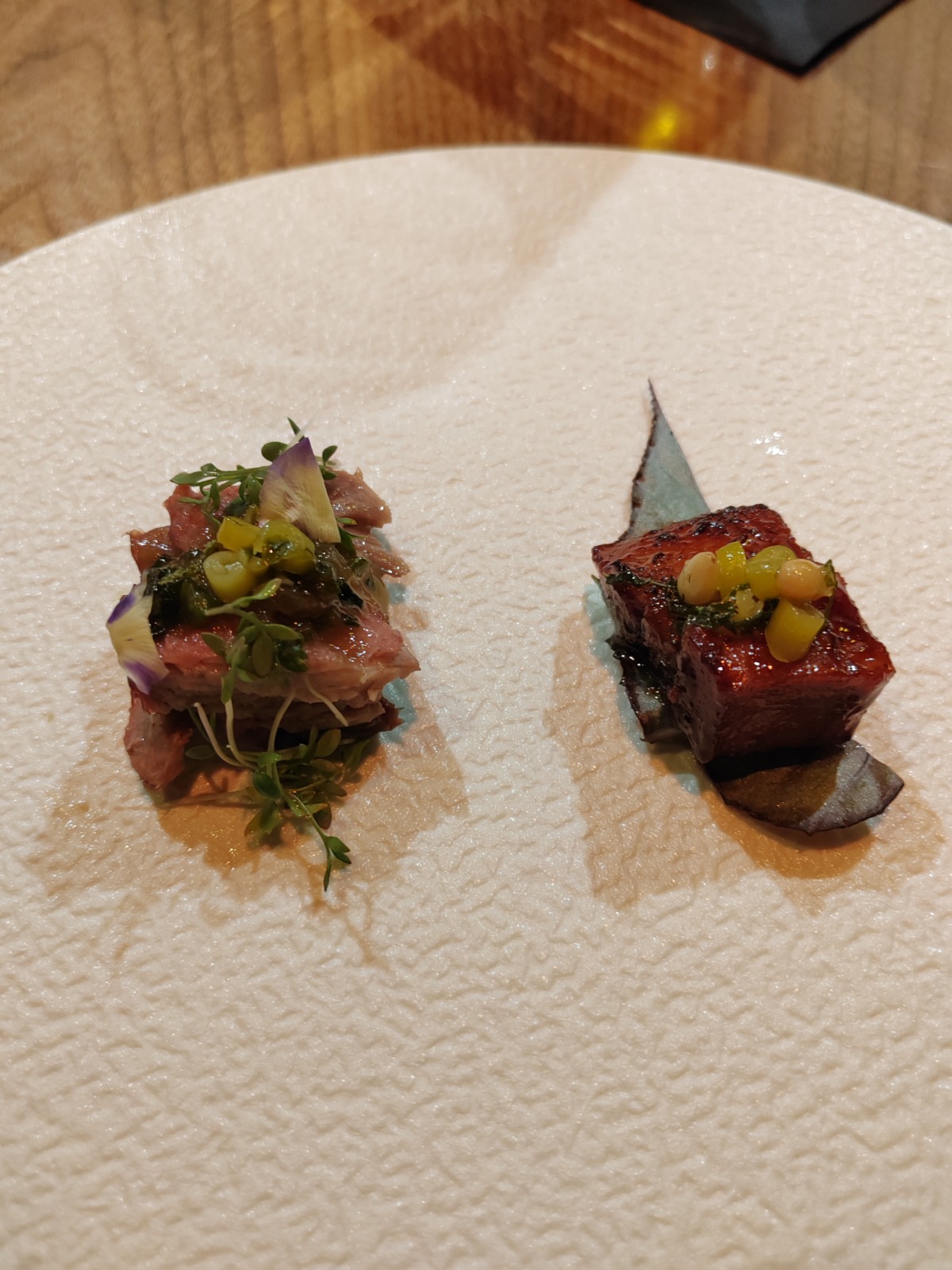 La progresión es lógica. La panceta a baja temperatura confirma que el cerdo es el animal que mejor entiende el fuego lento, mientras que el pato hongkonés cumple con el canon agridulce y picante que uno espera. Hay espacio para el mestizaje más directo, como la picaña con arroz meloso —un puente entre América y Asia que funciona— o un tuétano servido con un pan de textura aérea, casi una nube, que invita a untar sin complejos.