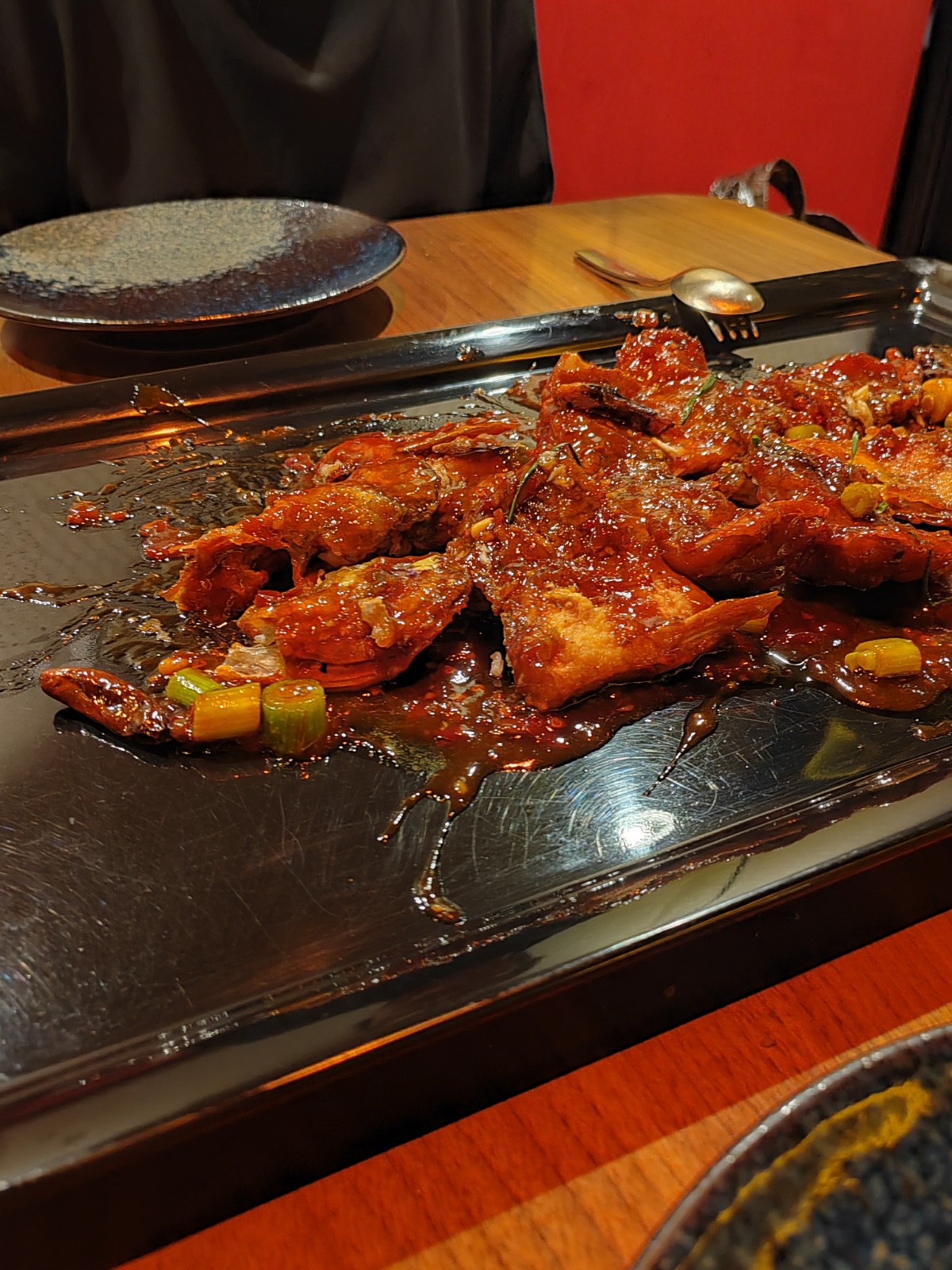 Sin embargo, el momento de mayor impacto es el «pez de fuego». Una lubina que llega a la mesa envuelta en llamas y que el servicio desespina con precisión quirúrgica usando dos cucharas. Es puro oficio y puesta en escena. Para terminar, un postre de café y maracuyá; correcto, pero como sucede a menudo en la cocina asiatica, se siente algo prescindible tras el despliegue de los platos salados.